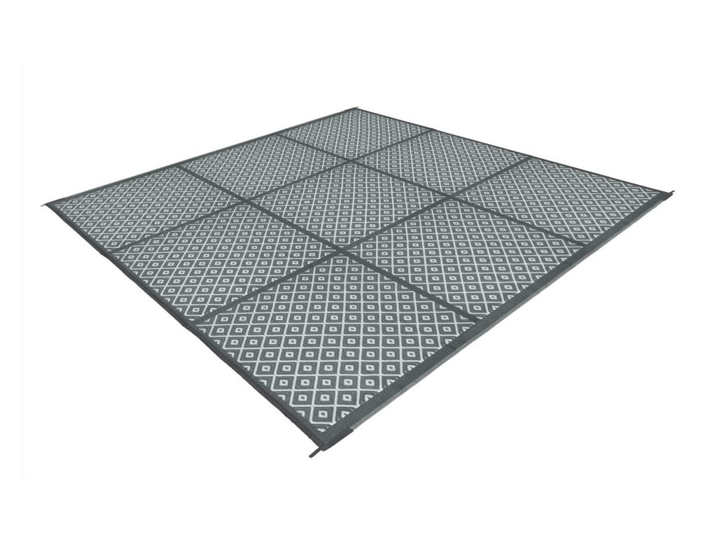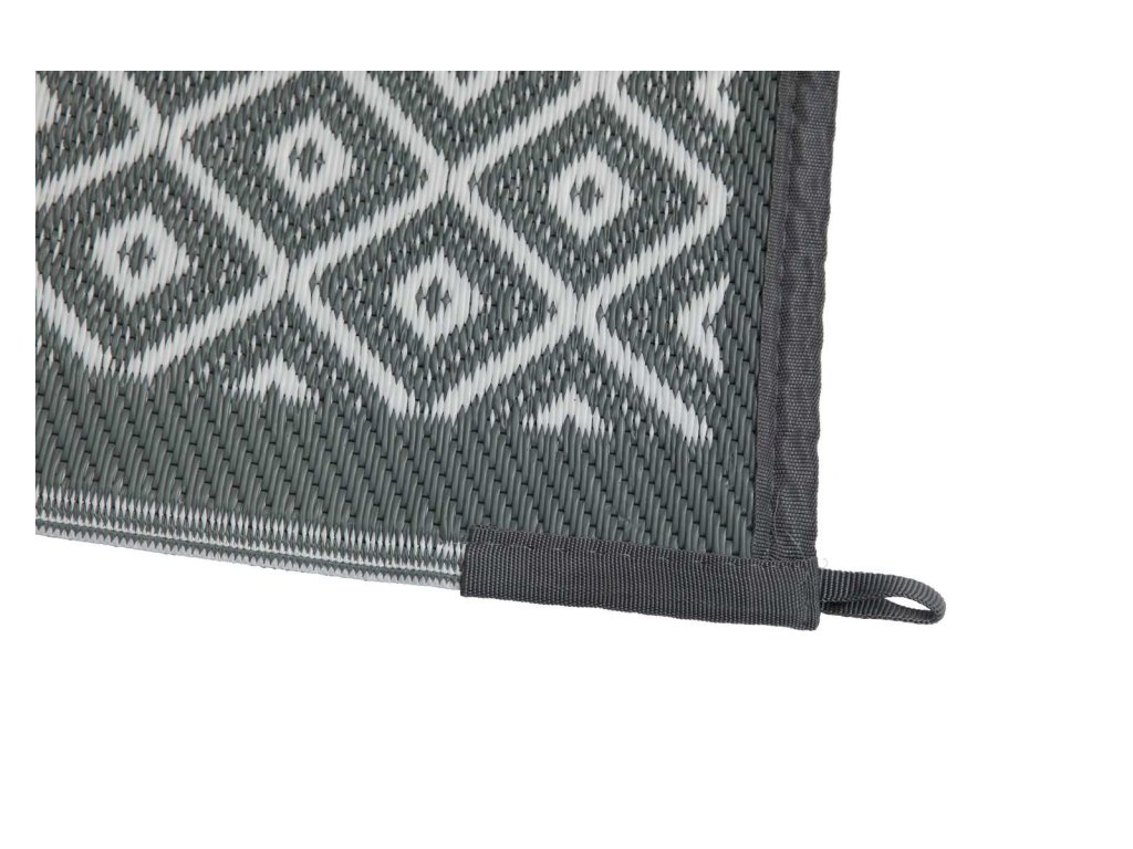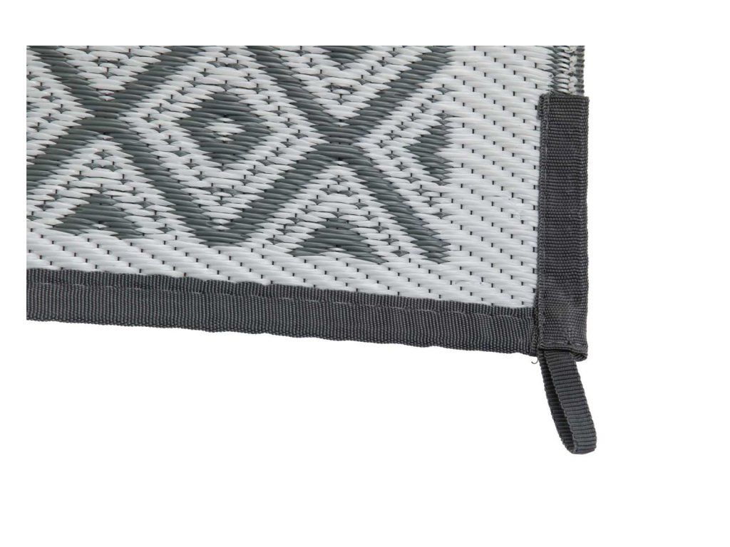 Praktický všestranný koberec pod markýzu, na terasu, altán nebo pro venkovní piknik! Koberec je oboustranný v šedo/bílé barvě. Je robustní a odolný vůči UV záření a je vyroben z recyklovaného polypropylenu. S upevňovacími smyčkami v rozích. Včetně praktického popruhu.
