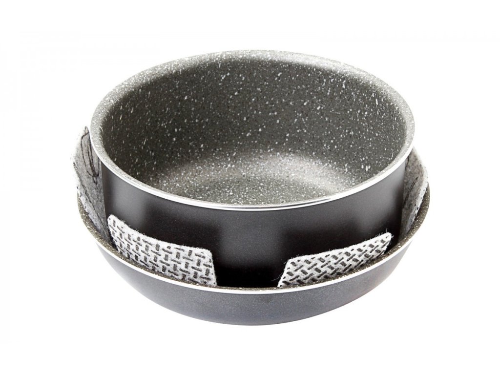 Sada hliníkových hrnců s kvalitní nepřilnavou vrstvou a novou VACUBLOCK technologií = funkční řešení pro zabezpečení hrnců při transportu, stačí všechny díly složit do sebe a pevně zajistit pokličkou.