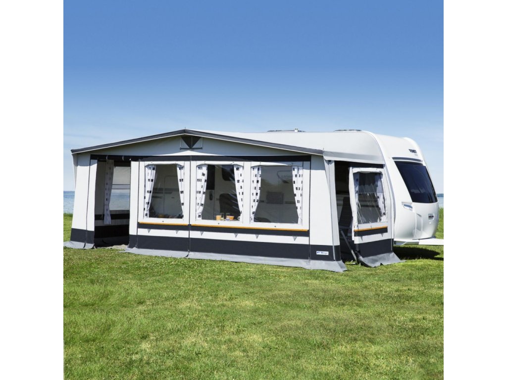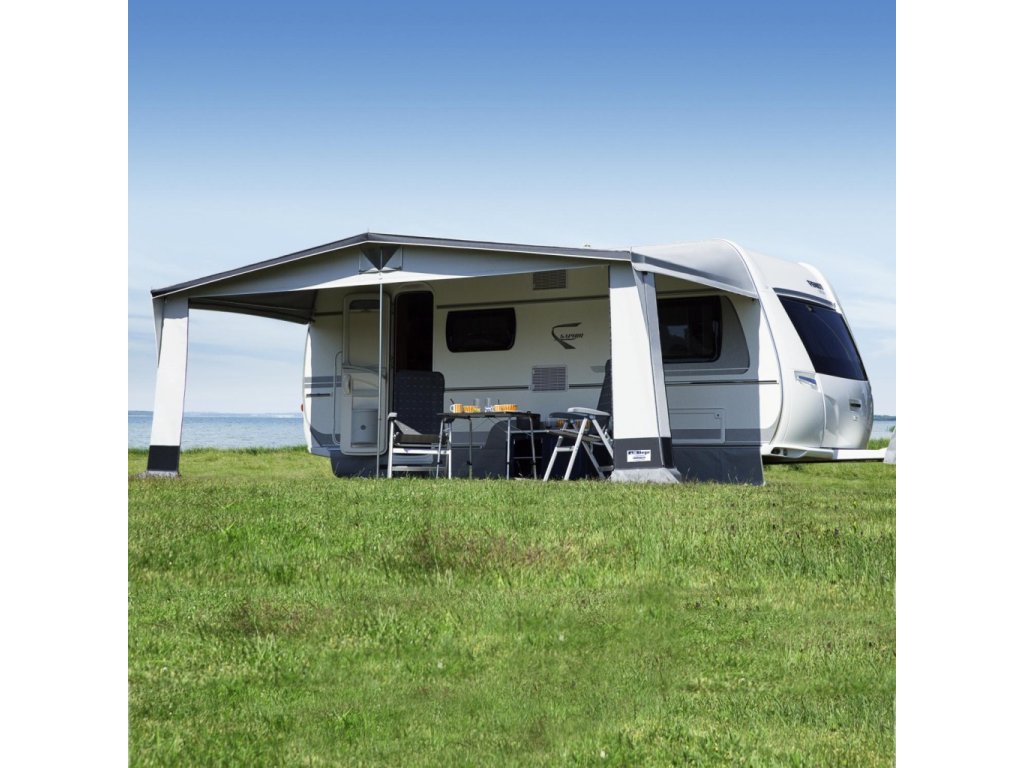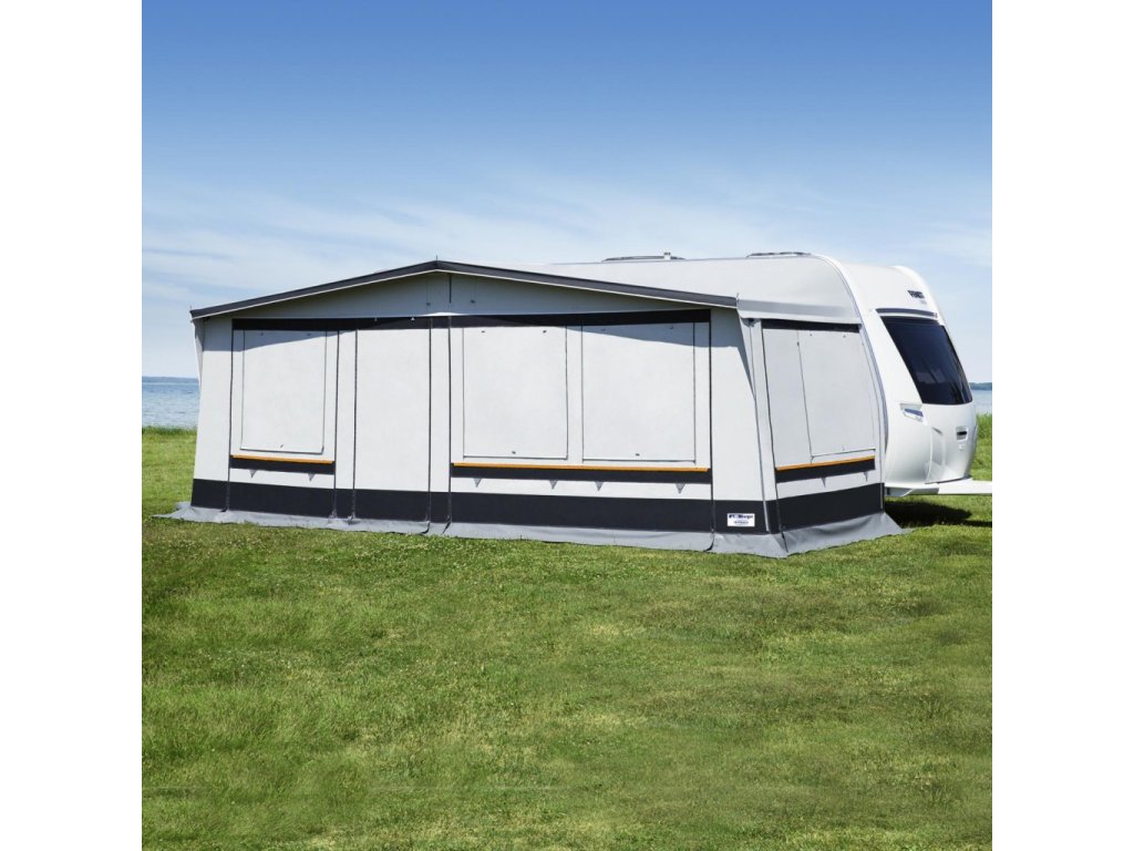 Vhodný do každého počasí, lehce omývatelný. Přední stěna je odnímatelná, čtyřdílná. Vstupní dveře vlevo, vpravo, nebo uprostřed. Efekt verandy. Okna jsou zatemnitelná a zavíratelná díky látkovým okenicím. Do velikosti 1030 se třemi okny na přední stěně, od 1060 s pěti okny. Větrání na štítu. Bočnice jsou odnímatelné. Velká odvětrávací okna se sítí proti hmyzu v obou bočnicích. Okna se zavírají s fóliovými okenicemi na zip. Bočnicové dveře lze srolovat na bok.