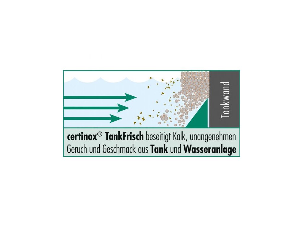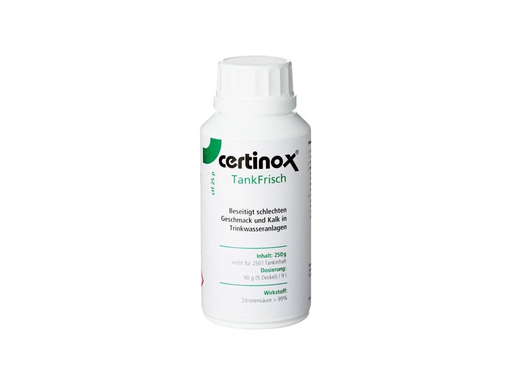 Certinox® – TankFrisch: odstraňuje zatuchlý zápach, špatnou chuť a vodní kámen ve vodních nádržích, potrubích a čerpadlech přírodní kyselinou citrónovou.