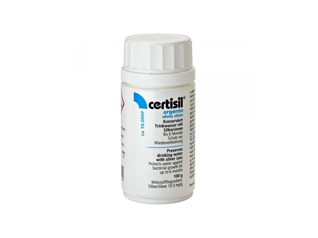 Prášek Certisil Argento 10000 P konzervuje pitnou vodu působením iontů stříbra a chrání ji až 6 měsíců před zamořením choroboplodnými zárodky. Balení 100 g prášku.