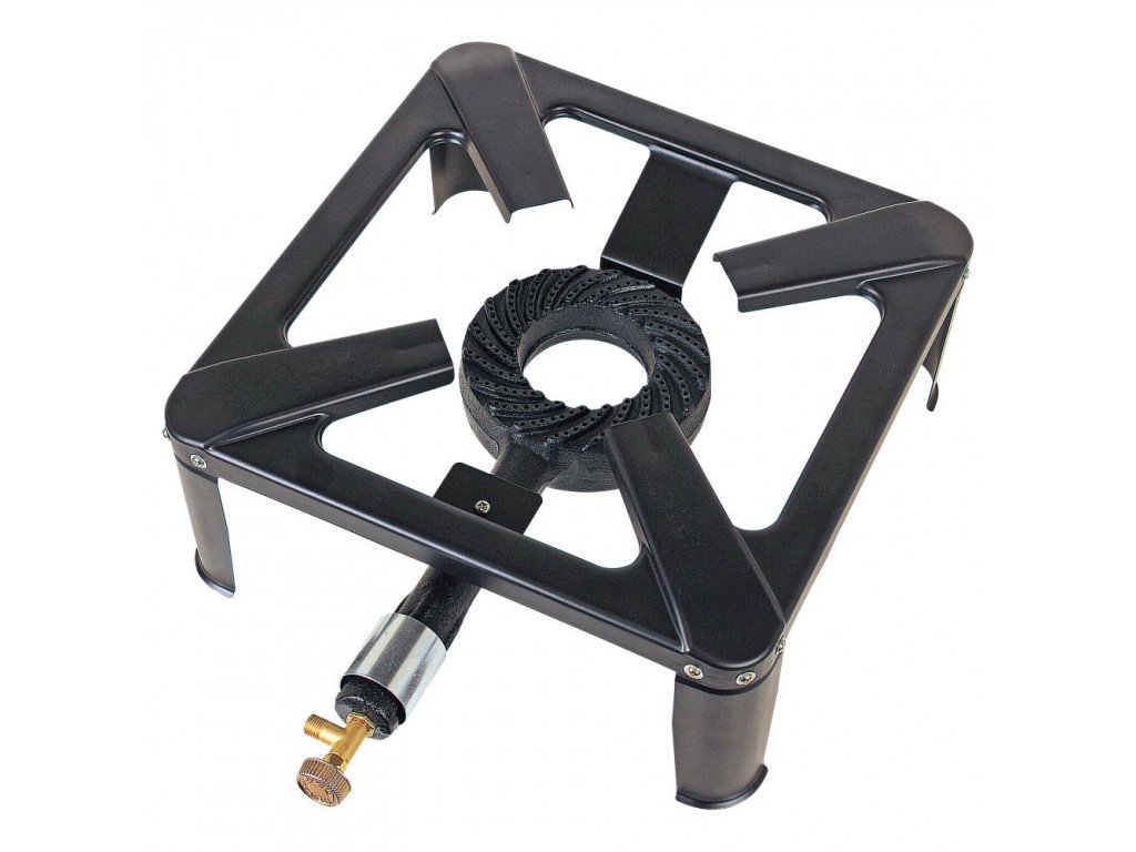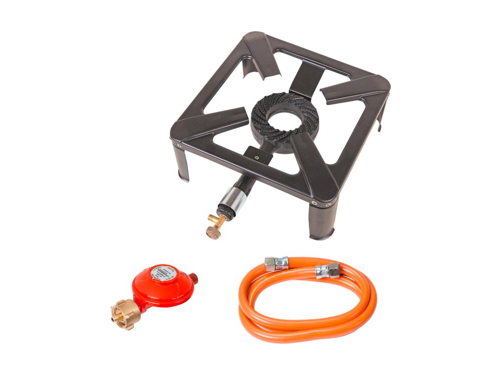 Dodávka obsahuje: Přenosný vařič se stabilním hořákem z masivní litiny a podstavcem z ocelového plechu. Nízkotlaková hadice 150 cm G1/4“ L a 50mbarový regulátor plynu.