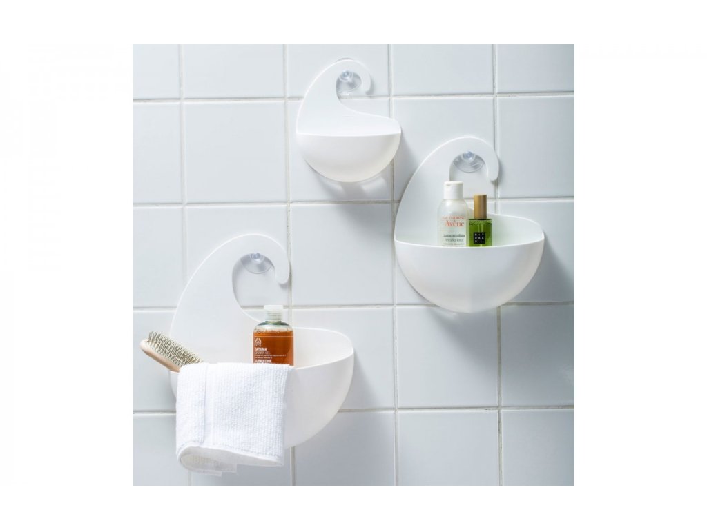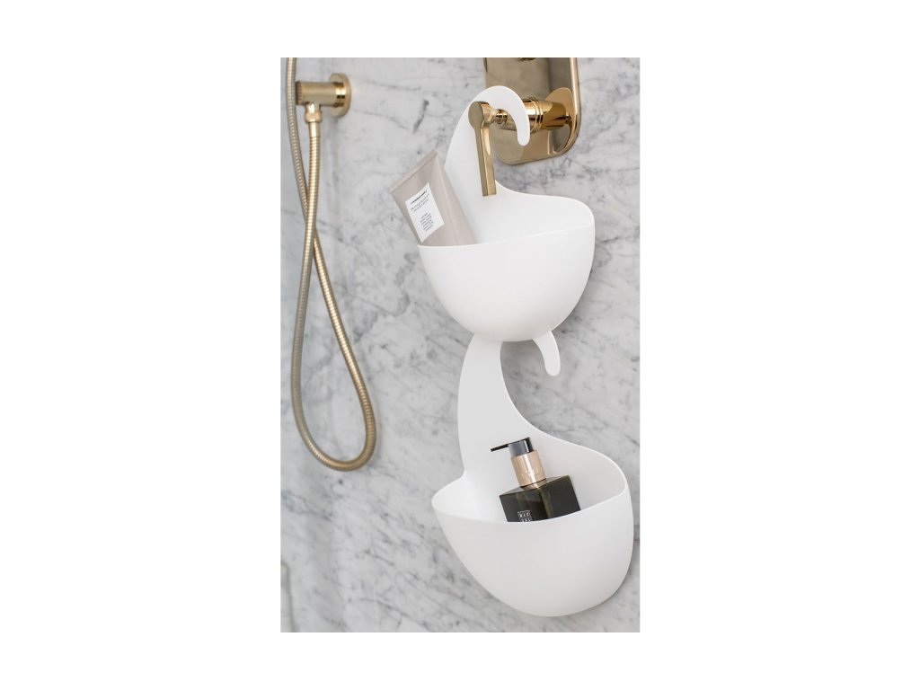 Praktický koupelnový organizátor z plastu s háčkem a odtokovým kanálkem na vodu.